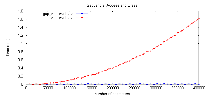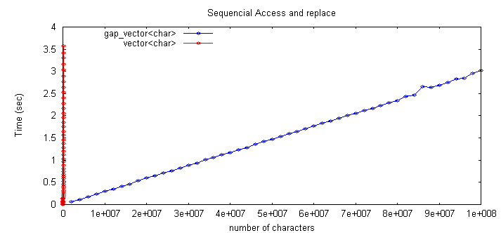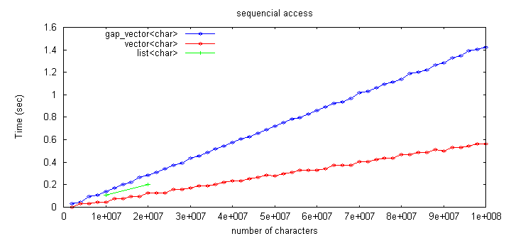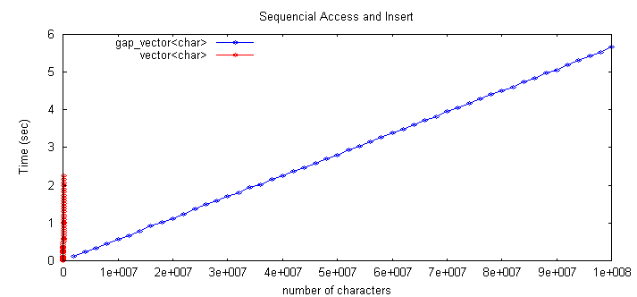 1億文字(100メガバイト)までのバッファについて、先頭から末尾までシーケンシャルにアクセスするのに要する時間。 list<char> は挿入位置によらず処理時間は一定。(だが、末尾挿入は vector より2桁遅い) 7文字進めて5文字削除 vector<char> は O(N^2) の処理時間がかかるが、gap_vector<char> はO(N)