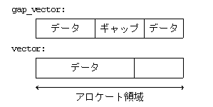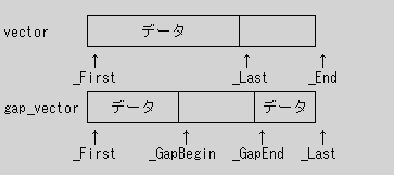 どちらも速度的問題がある。 gap_vector とは、下図の様にギャップ(空白)を挟んで保持するデータをアロケートしたメモリ領域の先頭と末尾に振り分けたものである。 ギャップを考慮してインデックス計算を行えばよいので、O(1) でランダムアクセスが可能