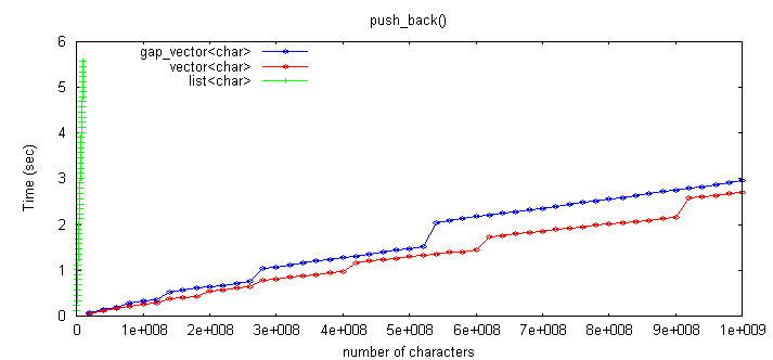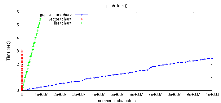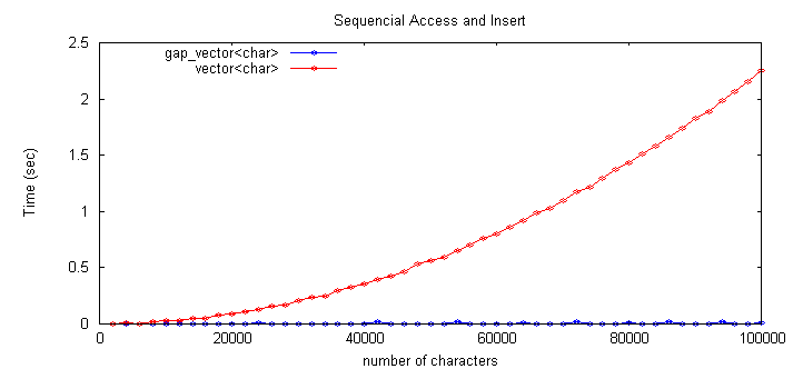 gap_vector<char> の先頭挿入処理は O(1) で、末尾挿入処理の約10倍の処理時間がかかった。