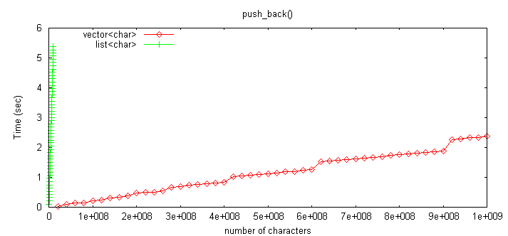 末尾への挿入(push_back())はどちらも O(1) であるが、下図の測定結果をみるとわかるように list は vector の100倍程度遅い(vector: 2.375*10^(-9), list:5.375*10^(-7))。