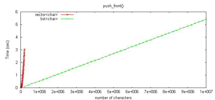 list<char> は構築・破棄に異様に時間がかかるので、1*10^7, 2*10^7 のみ計測した。